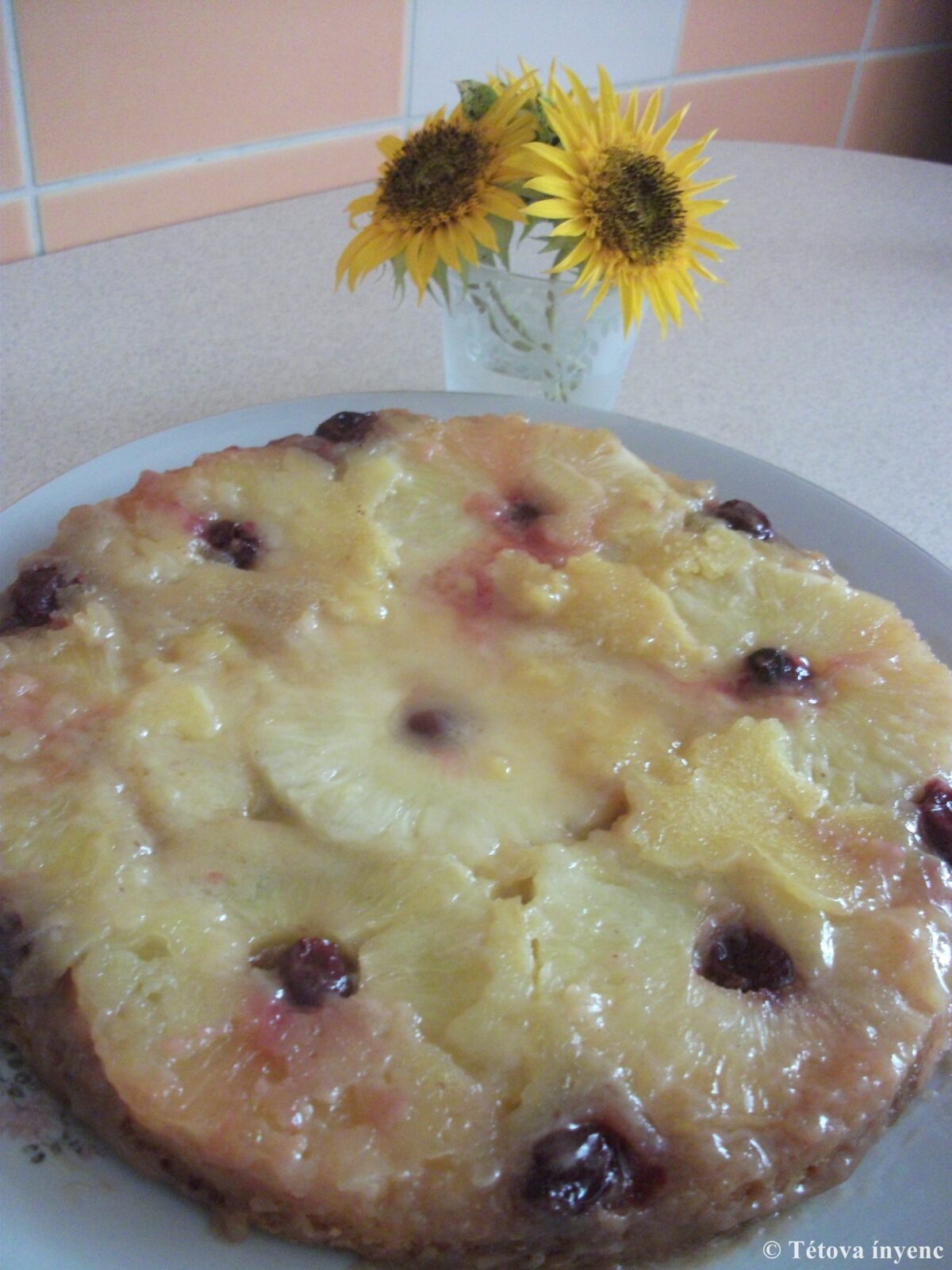 A karamellrétegre helyezem az ananászkorongokat. A lyukakba egy-egy szem meggyet teszek. Ráöntöm a tésztát és betolom a sütőbe. Kb. 50 perc kell a sütéshez, mindenesetre tűpróbával győződjünk meg, hogy átsült a tészta.
