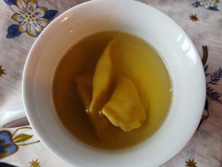 Én most készen kapható pisztáciás raviolival tálaltam, de önmagában is jó, vagy zöldséggel, más levesbetétekkel.