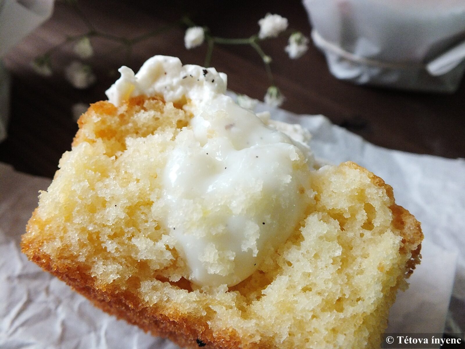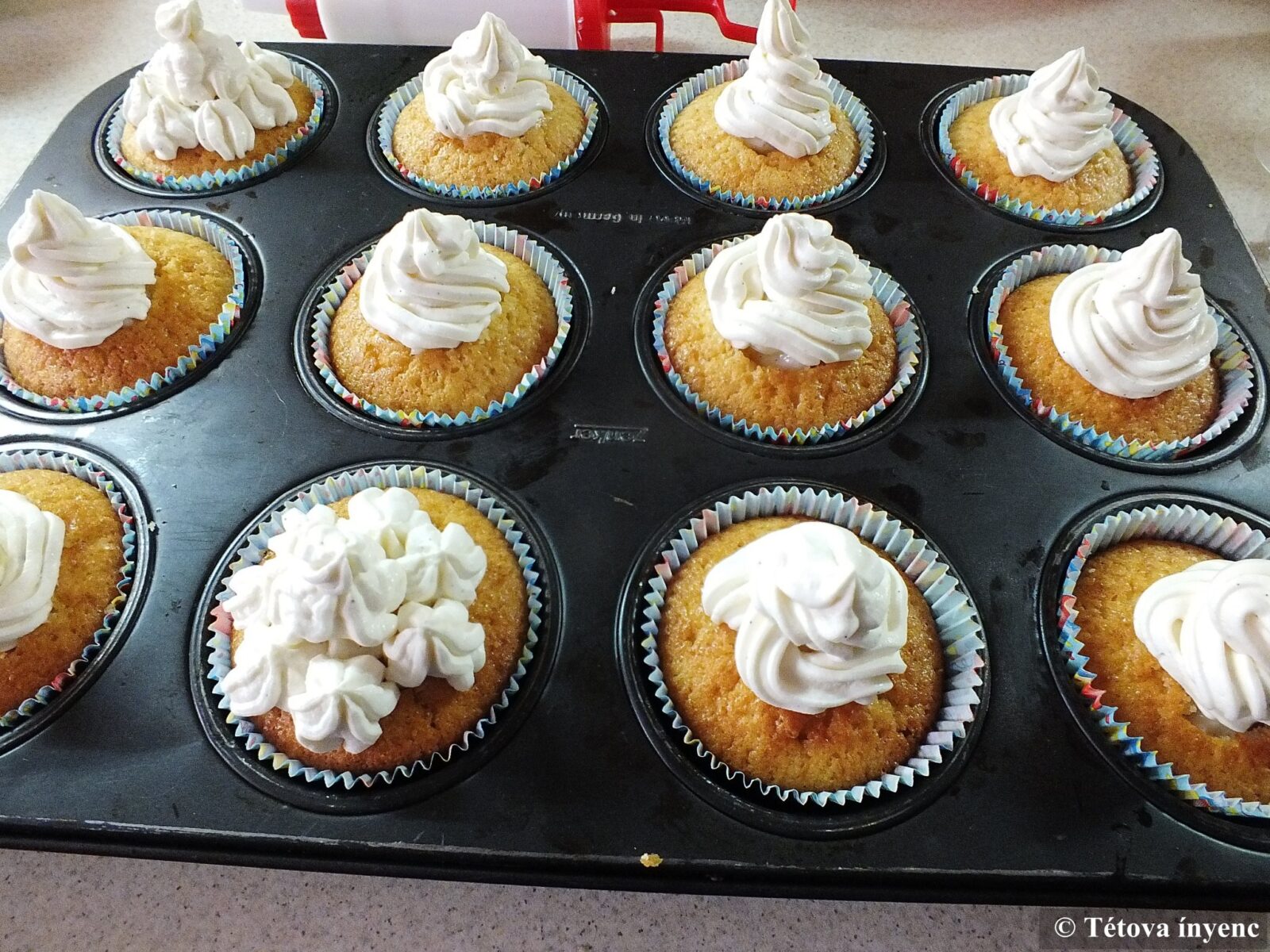 A mascarpone-t a tejszínnel, a vaníliamagokkal és a porcukorral habosra kavarom. A krémet habzsákba töltöm és ezzel díszítem a muffinok tetejét.