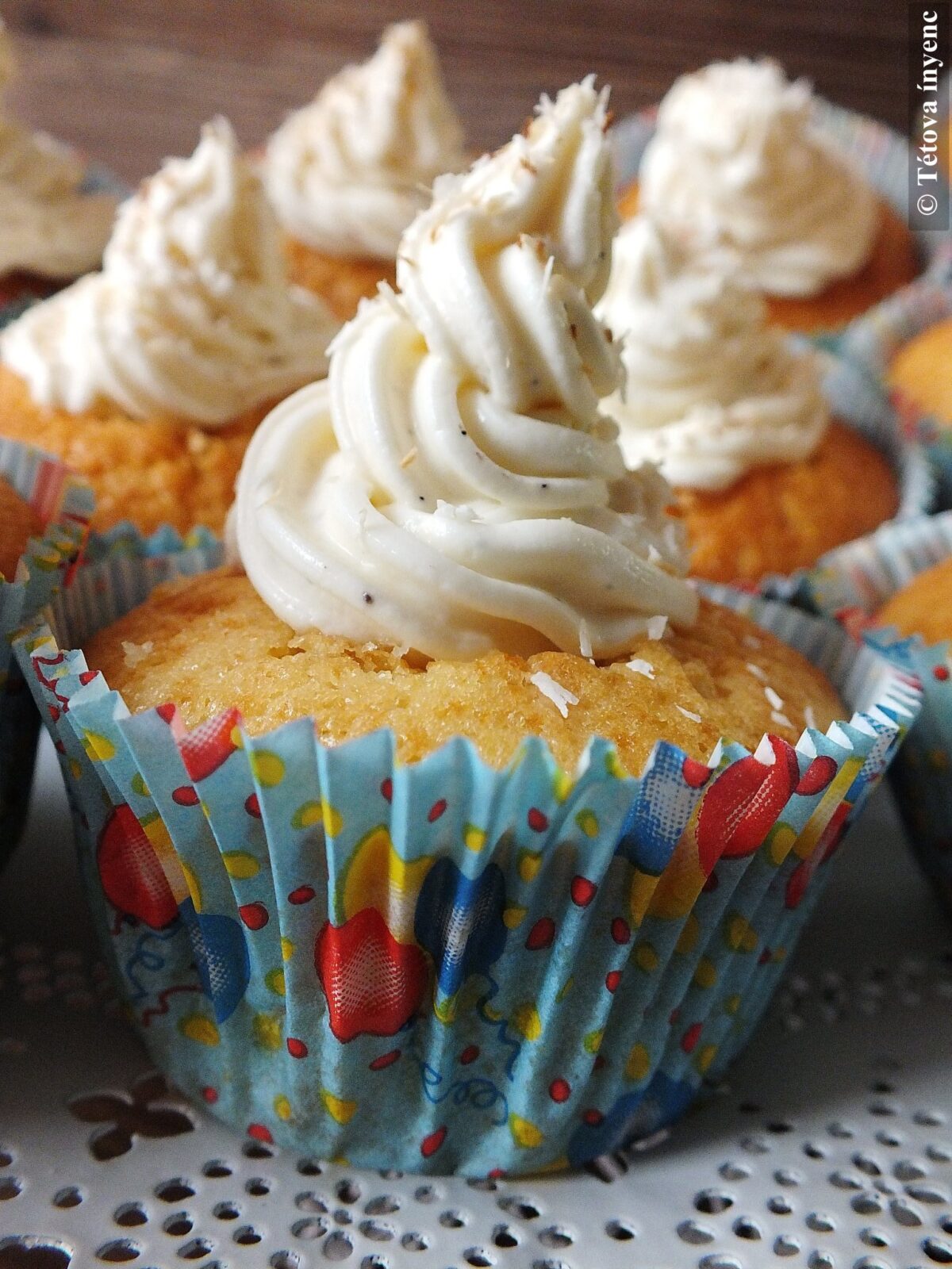 Az egy evőkanálnyi kókuszreszeléket száraz serpenyőben kissé megpirítom. Ha kihűlt, ezzel szórom meg a fehér sipkás muffinokat.