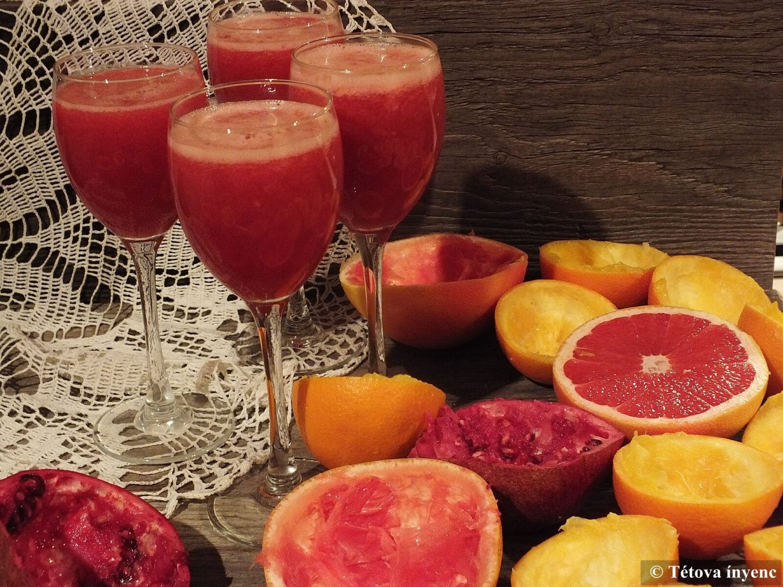 Vitaminkúra tél végére. A gránátalma és a narancs édes, kell hozzá a grapefruit fanyarsága. Más nem is kell. Csak kifacsarom és kész az elixír. Naponta tudnám inni…