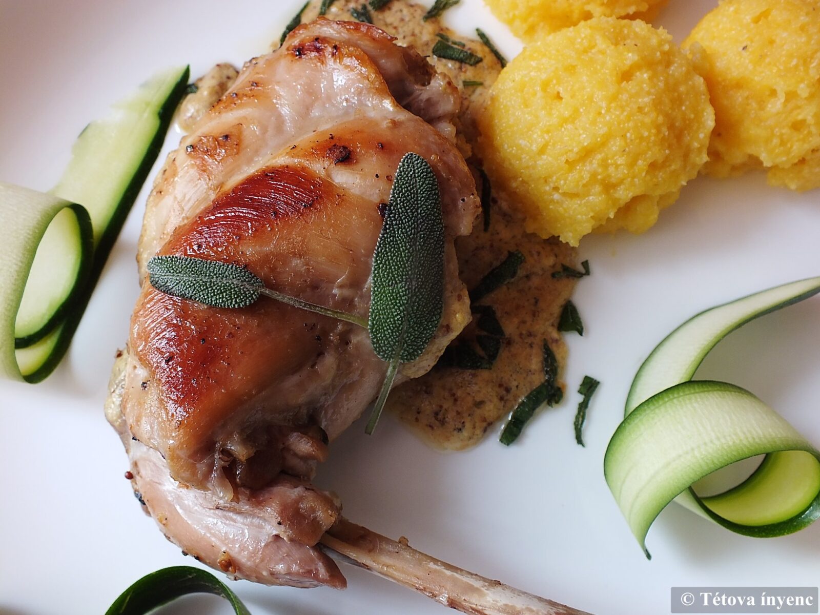 A zsályát apróra vágom. A sült nyúlcombokat a zsályával megszórt mustármártással és puliszkával tálalom. Jól csúszik hozzá a maradék bor.