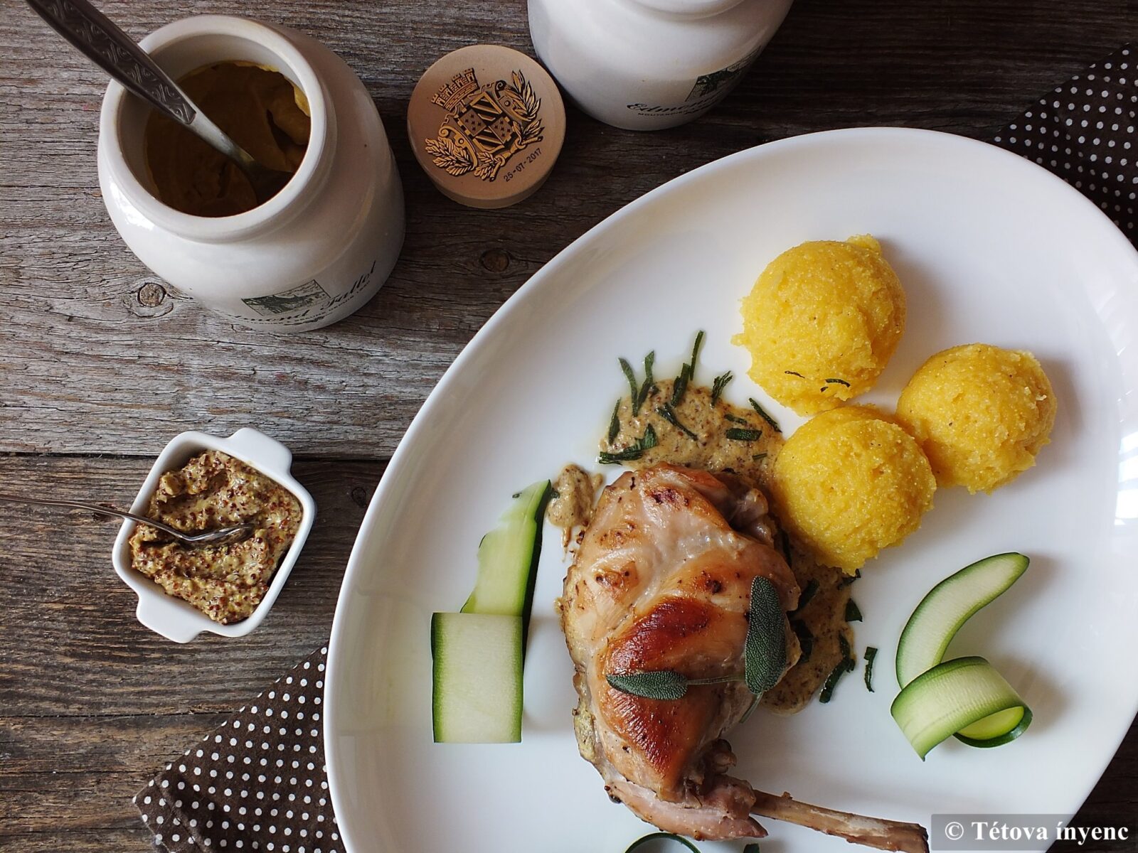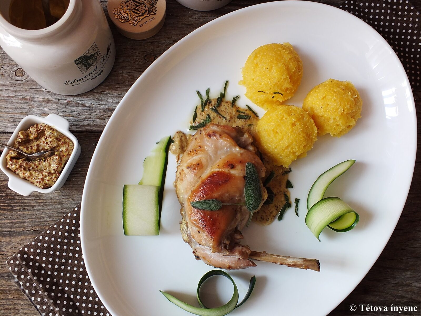 Mivel a jószerencsém igazi, dijoni mustárhoz juttatott, muszáj volt ételt komponálnom hozzá. A nyúlcombok tökéletesen illeszkedtek a megálmodott ízvilágba. Puliszkával ettük, de ez nincs kőbe vésve. Tulajdonképpen a nyúl sem, más hússal is jó lehet, a lényeg a jó minőségű mustár.