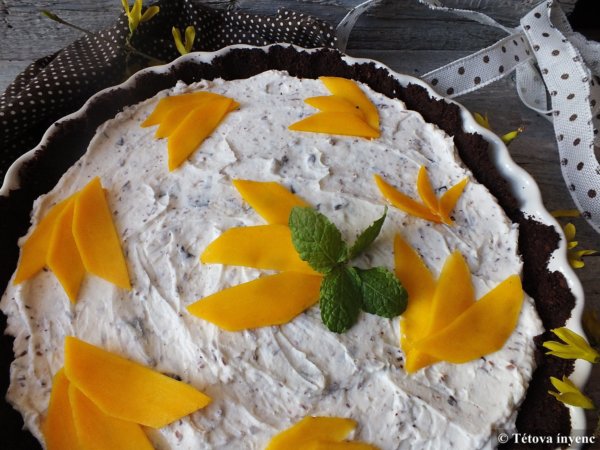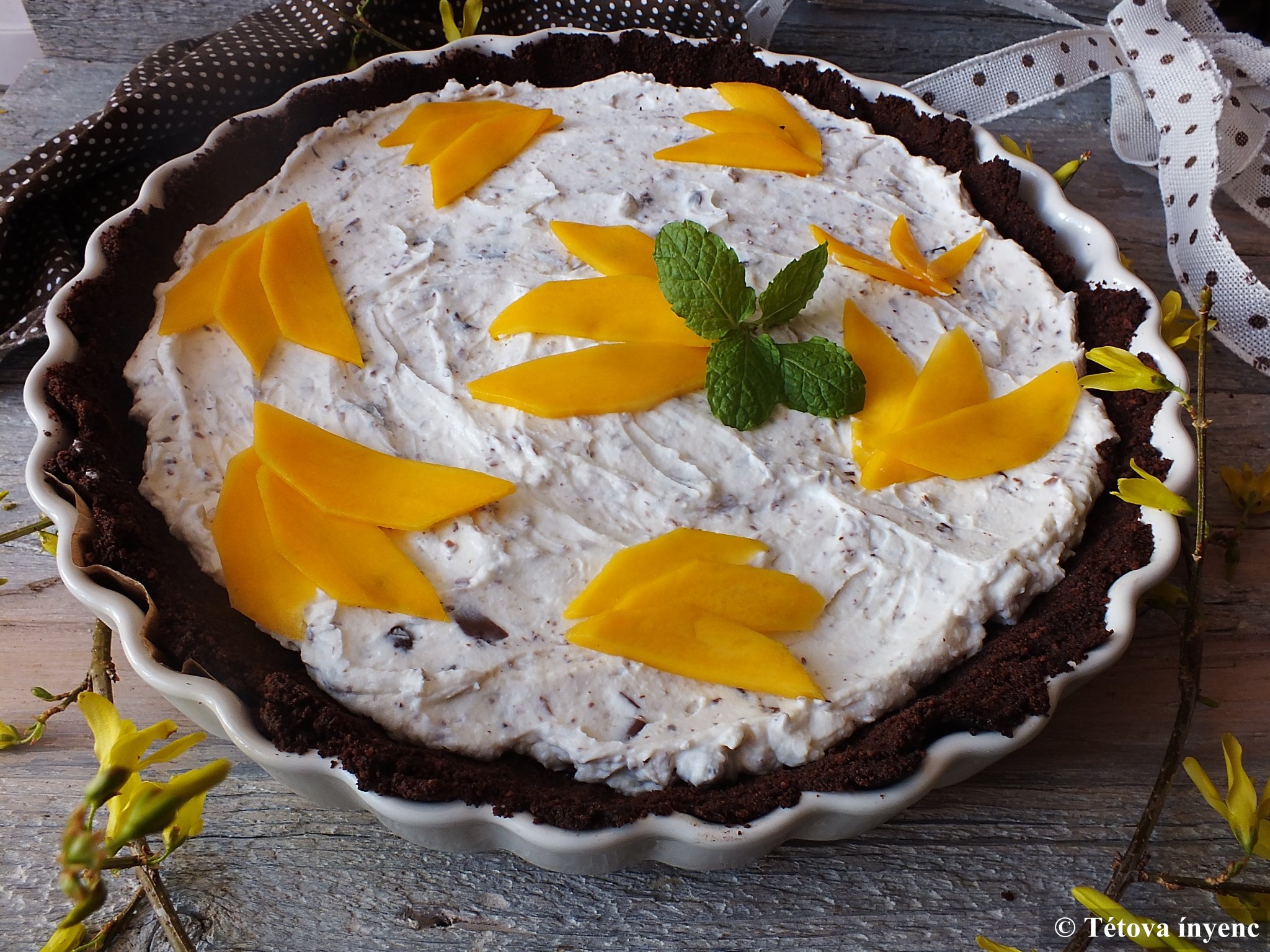 - A mangót vékony szeletekre vágom és a pitét feldíszítem.