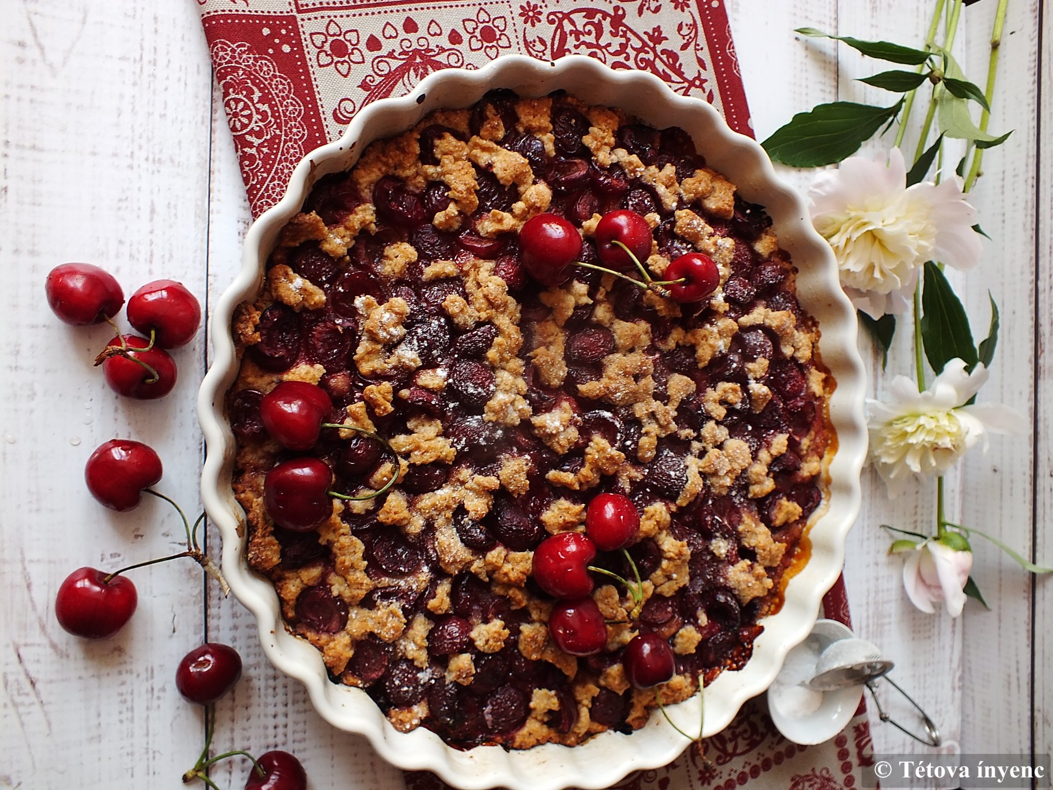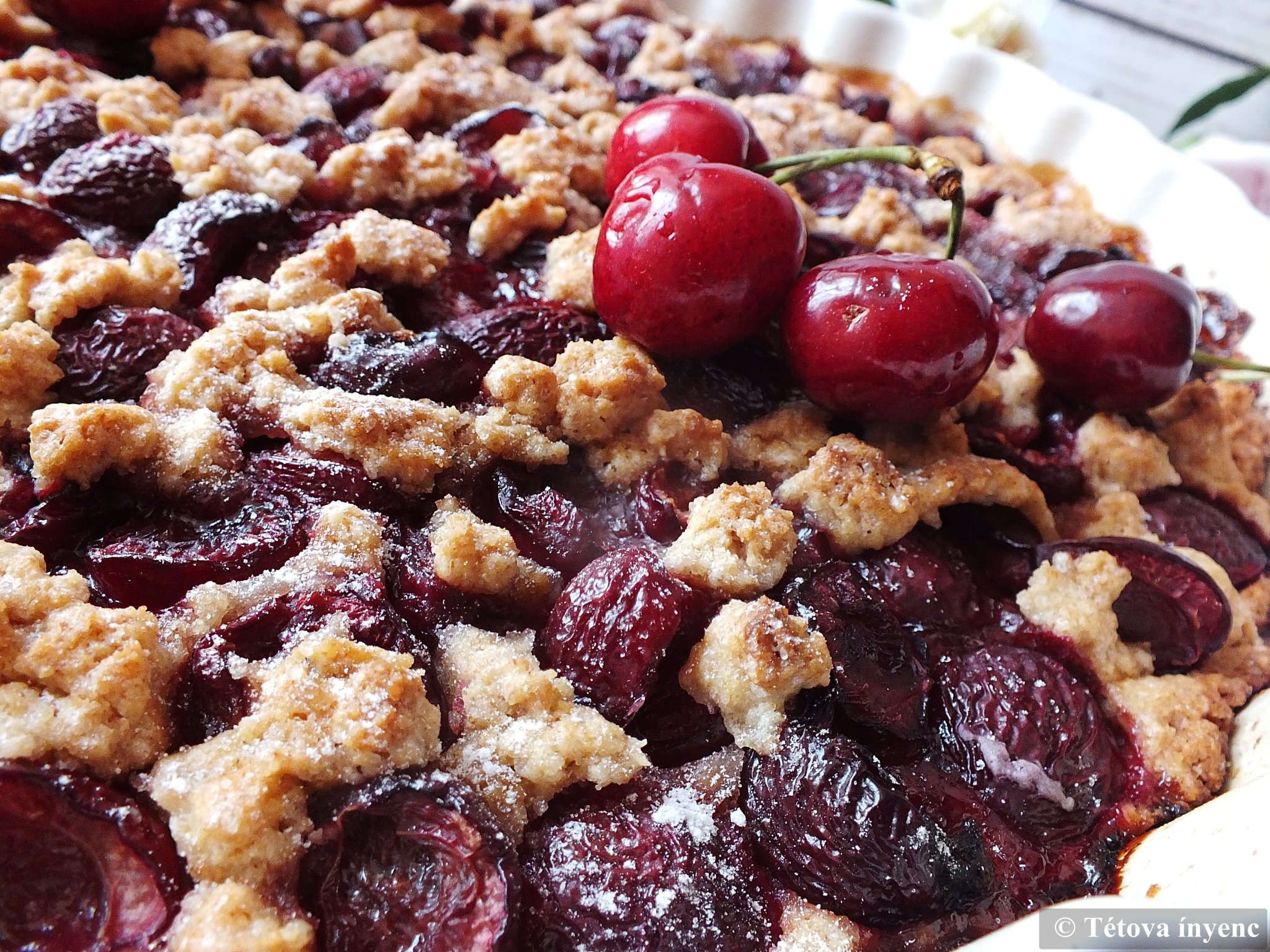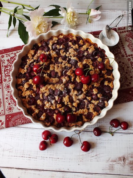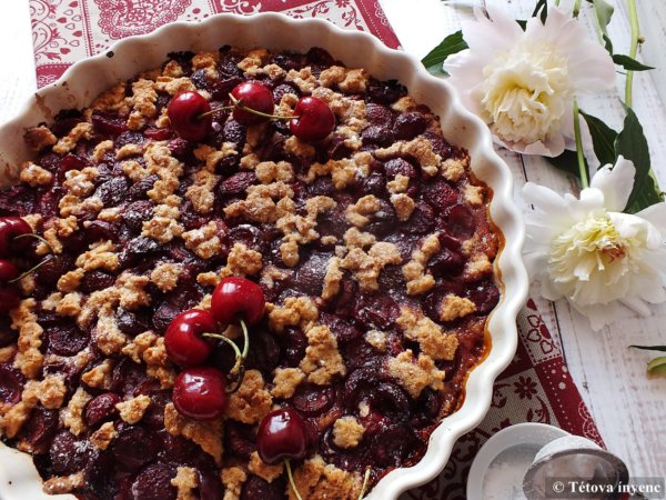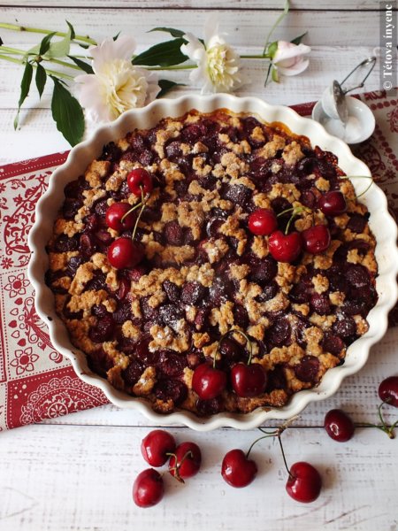 3. A pitén elosztom a cseresznyés keveréket. Rámorzsolom a maradék tésztát.