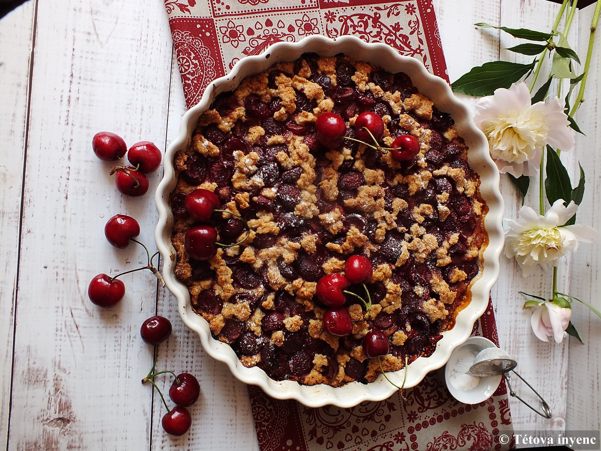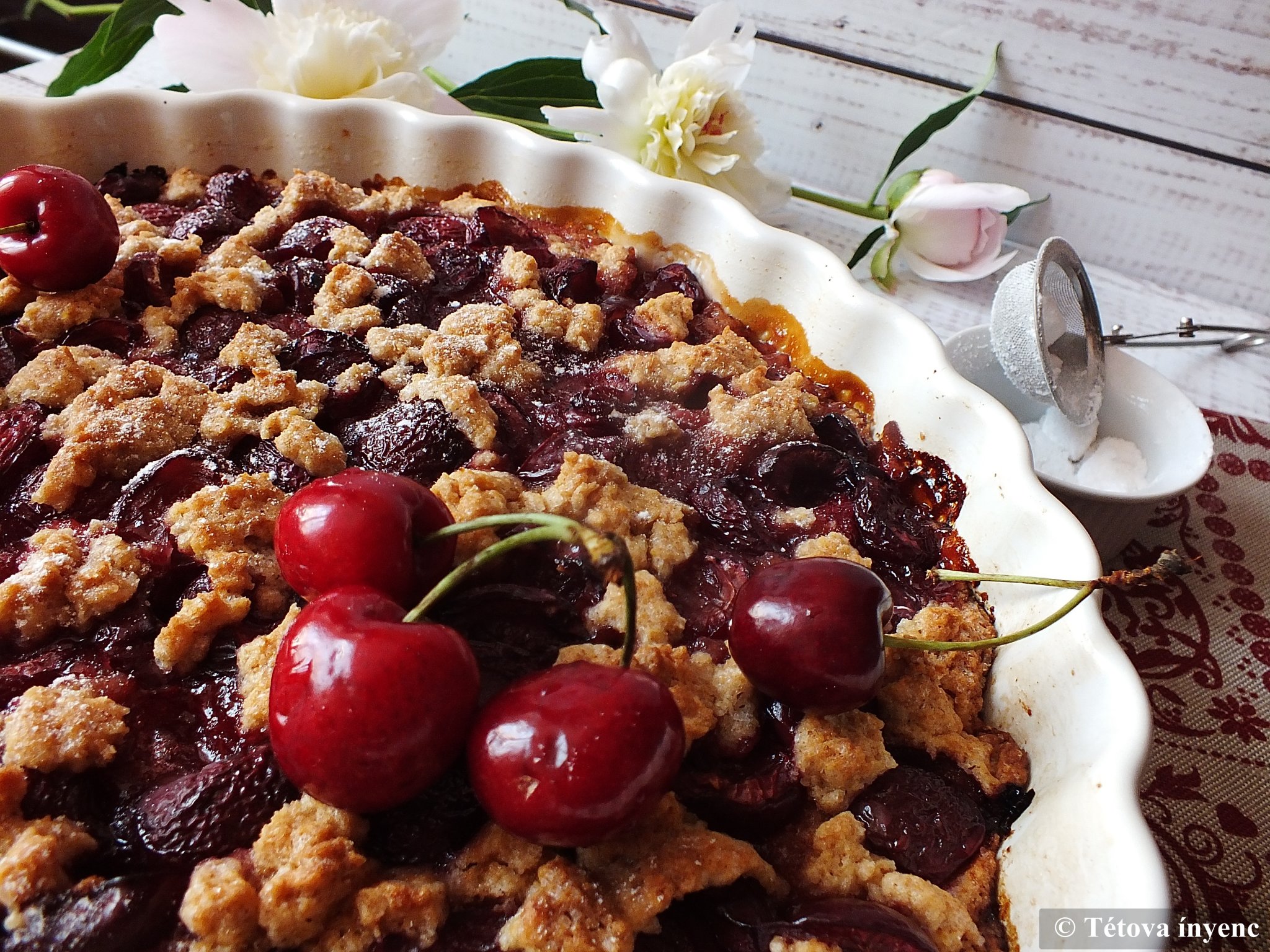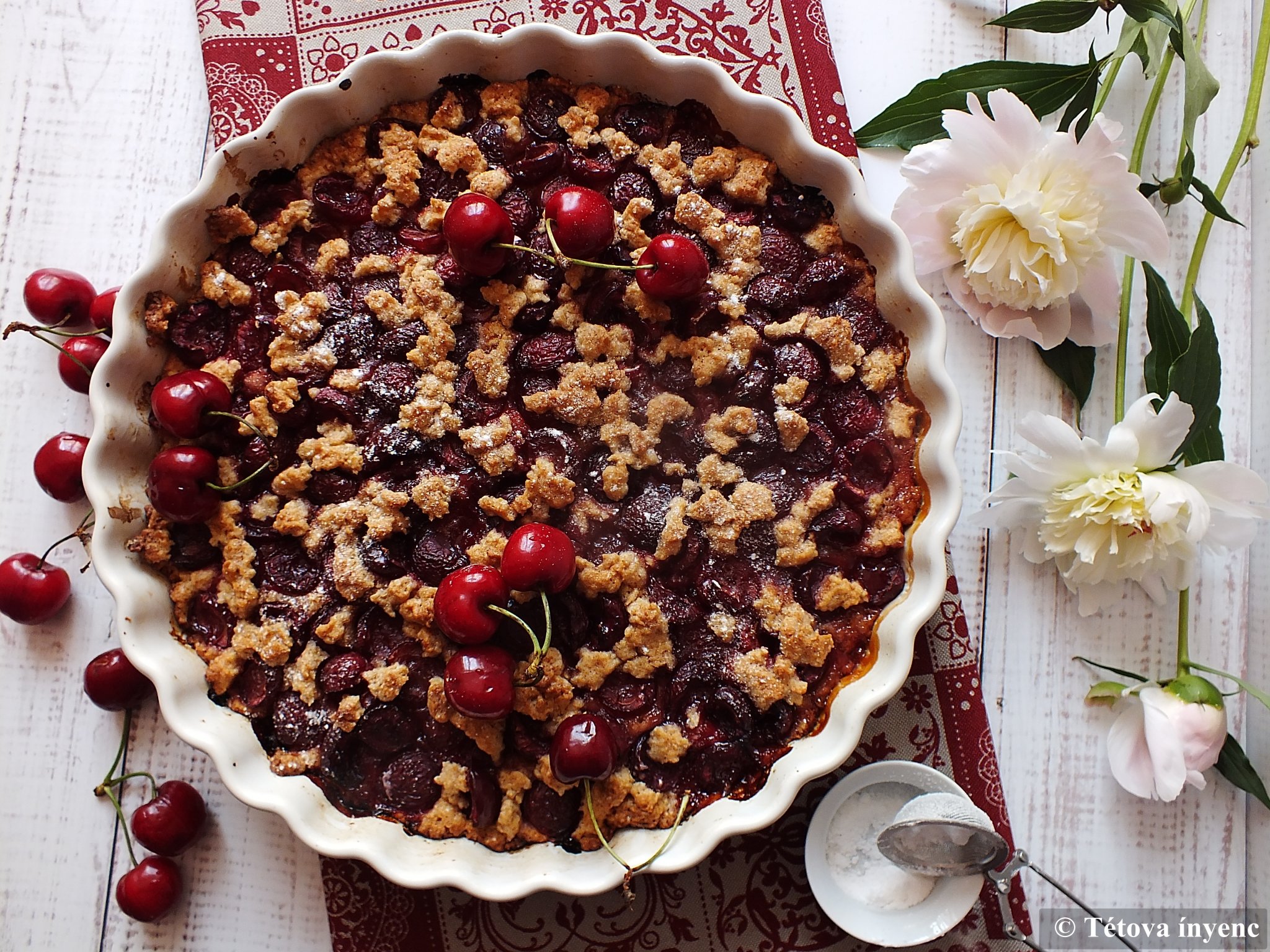 3. A pitén elosztom a cseresznyés keveréket. Rámorzsolom a maradék tésztát.