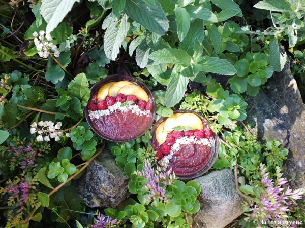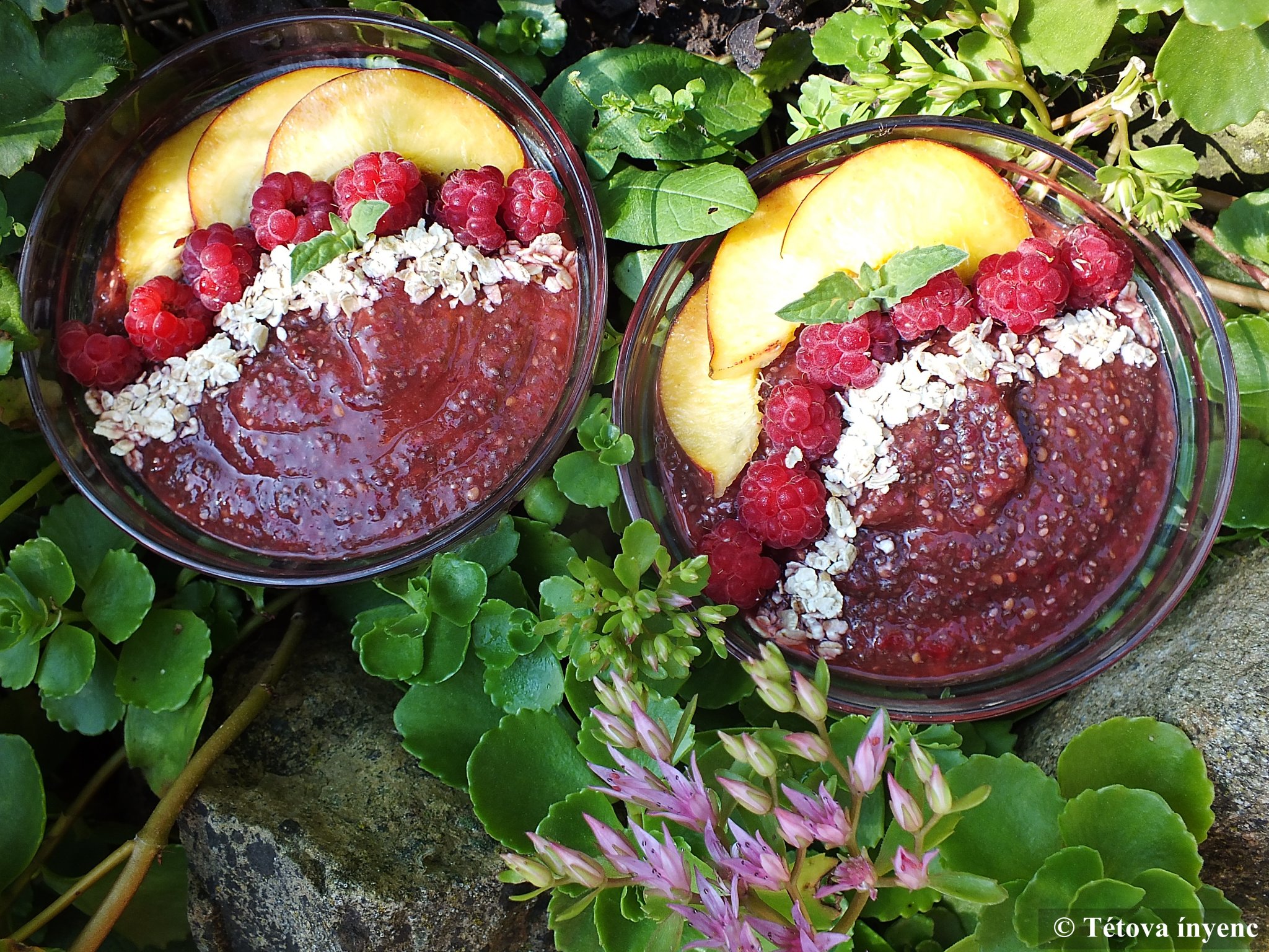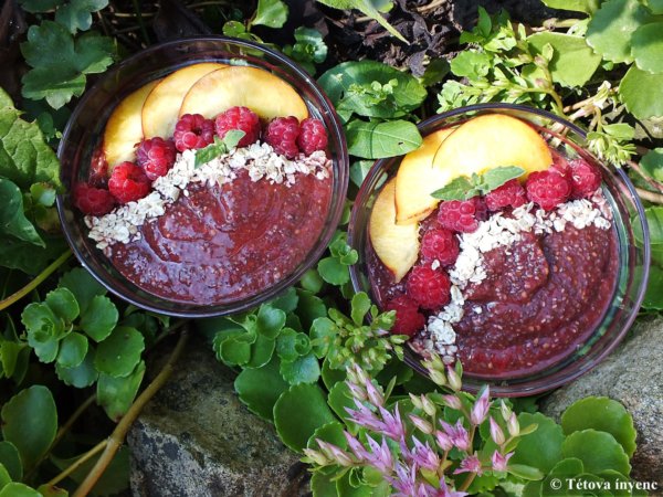 Sokan kérdezik, hogy hogyan találok ki új recepteket. A mai még friss, ezért könnyű felidéznem. Néhány őszibarackot szerettem volna megmenteni az enyészettől, ezért elsőként egy barackos smoothie-ra gondoltam. Előző este málnát szedtem, gondoltam, viszek egy kis színt a smoothie-ba. De amikor fel kellett volna öntenem vízzel a bíborvörös gyümölcsvelőt, megsajnáltam, és inkább chia magot szórtam bele.