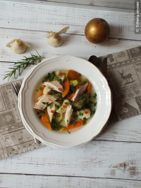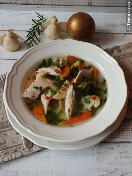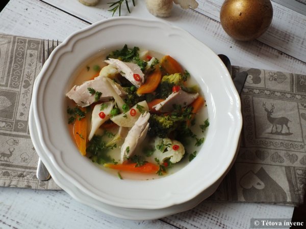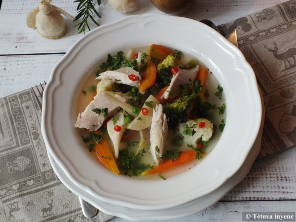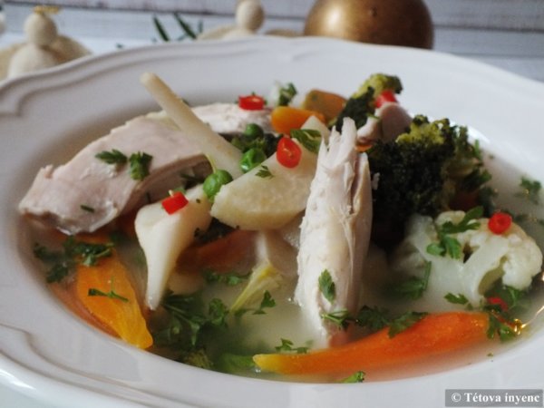 - A hús bőrét lefejtjük, a csontokat kiszedjük. A húst nagyobb darabokra szedjük és visszatesszük a levesbe.