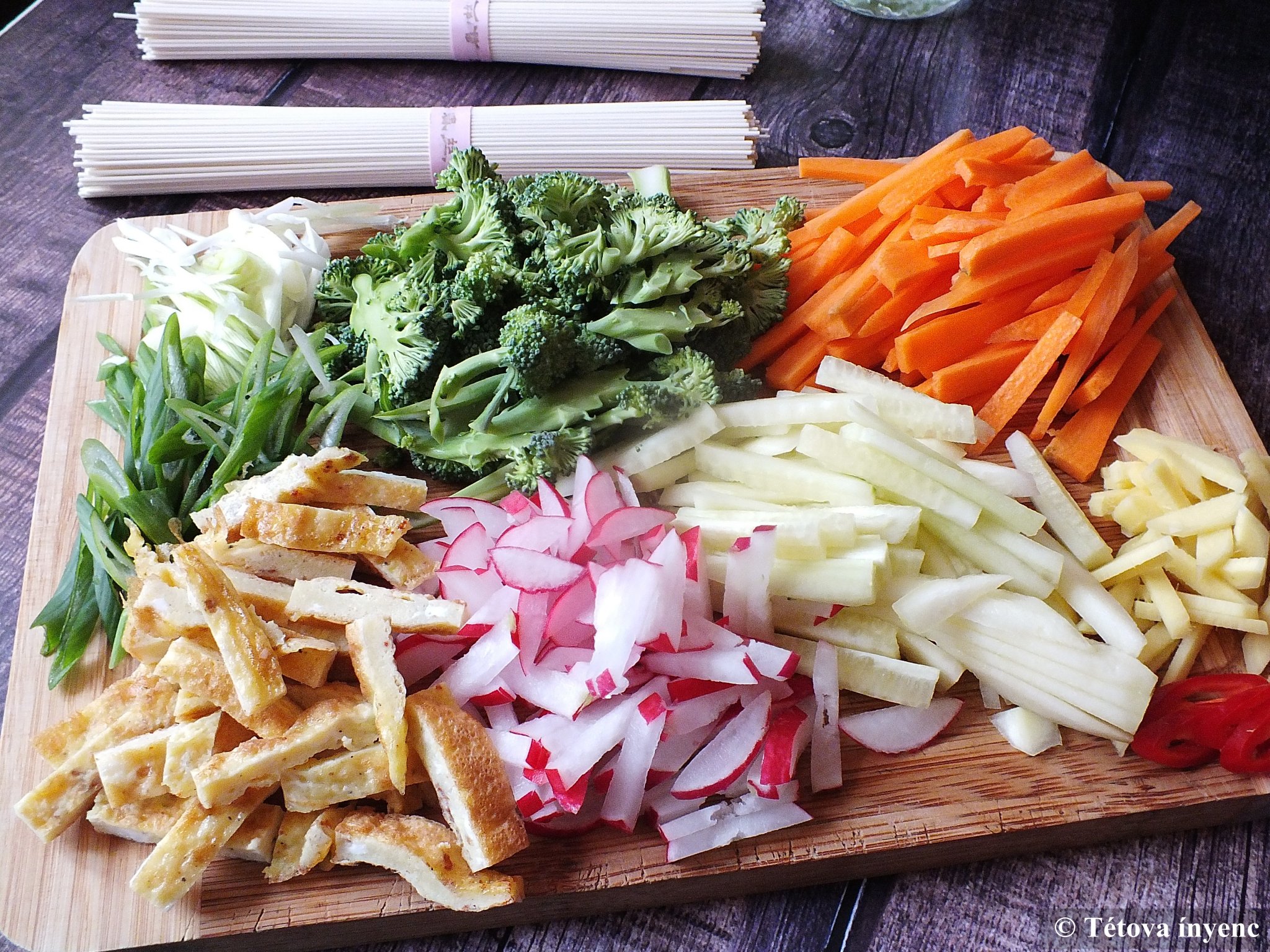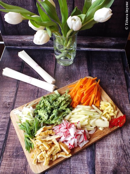 - A zöldségeket megpucoljuk, julienne-re vágjuk. A chilit felkarikázzuk, a fokhagymát és a gyömbért apróra vágjuk.