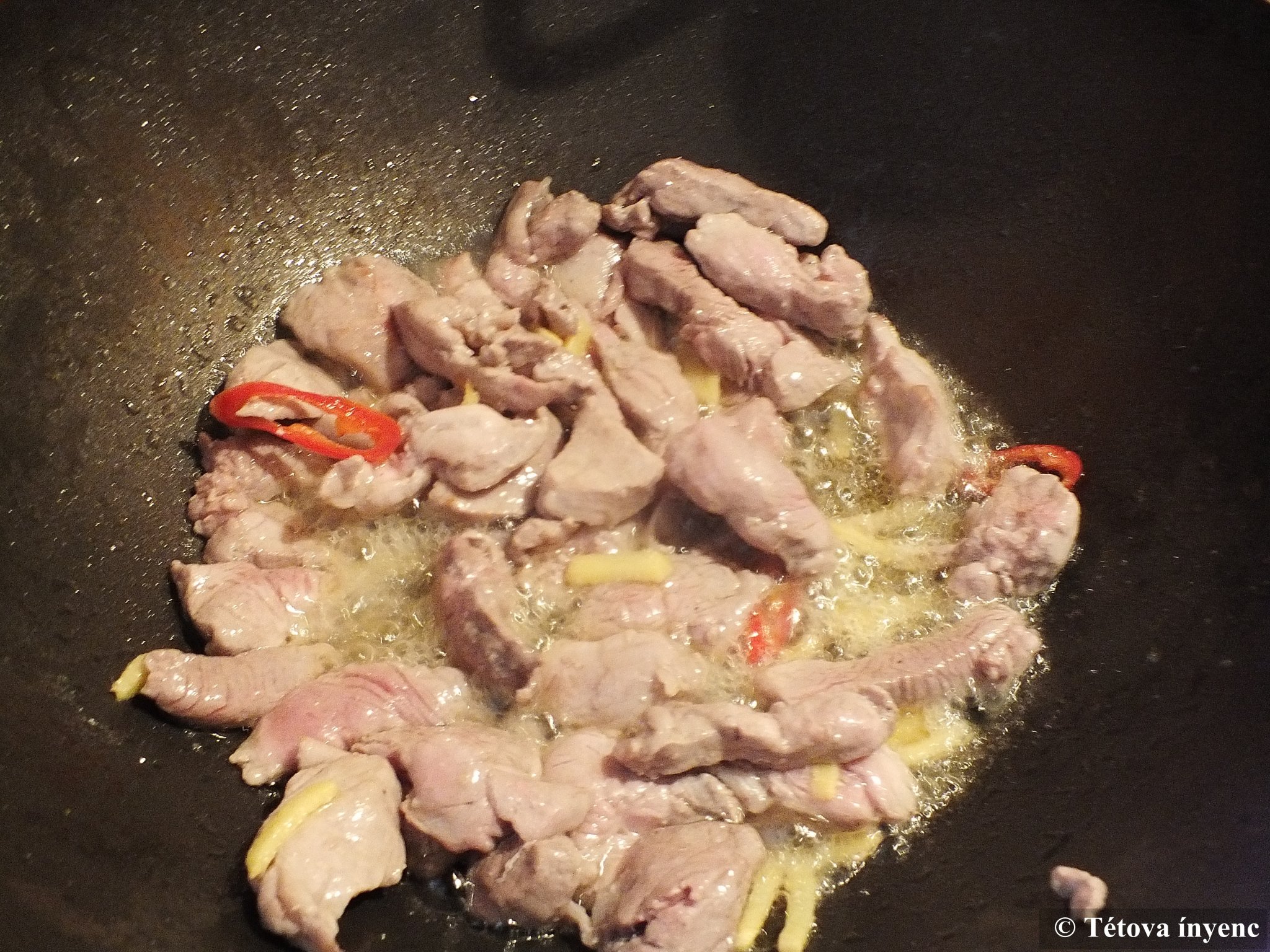 - A húst csíkokra vágjuk. Wokban, forró olajon megpirítjuk. ízesítjük sóval, fokhagymával, gyömbérrel, chilivel.