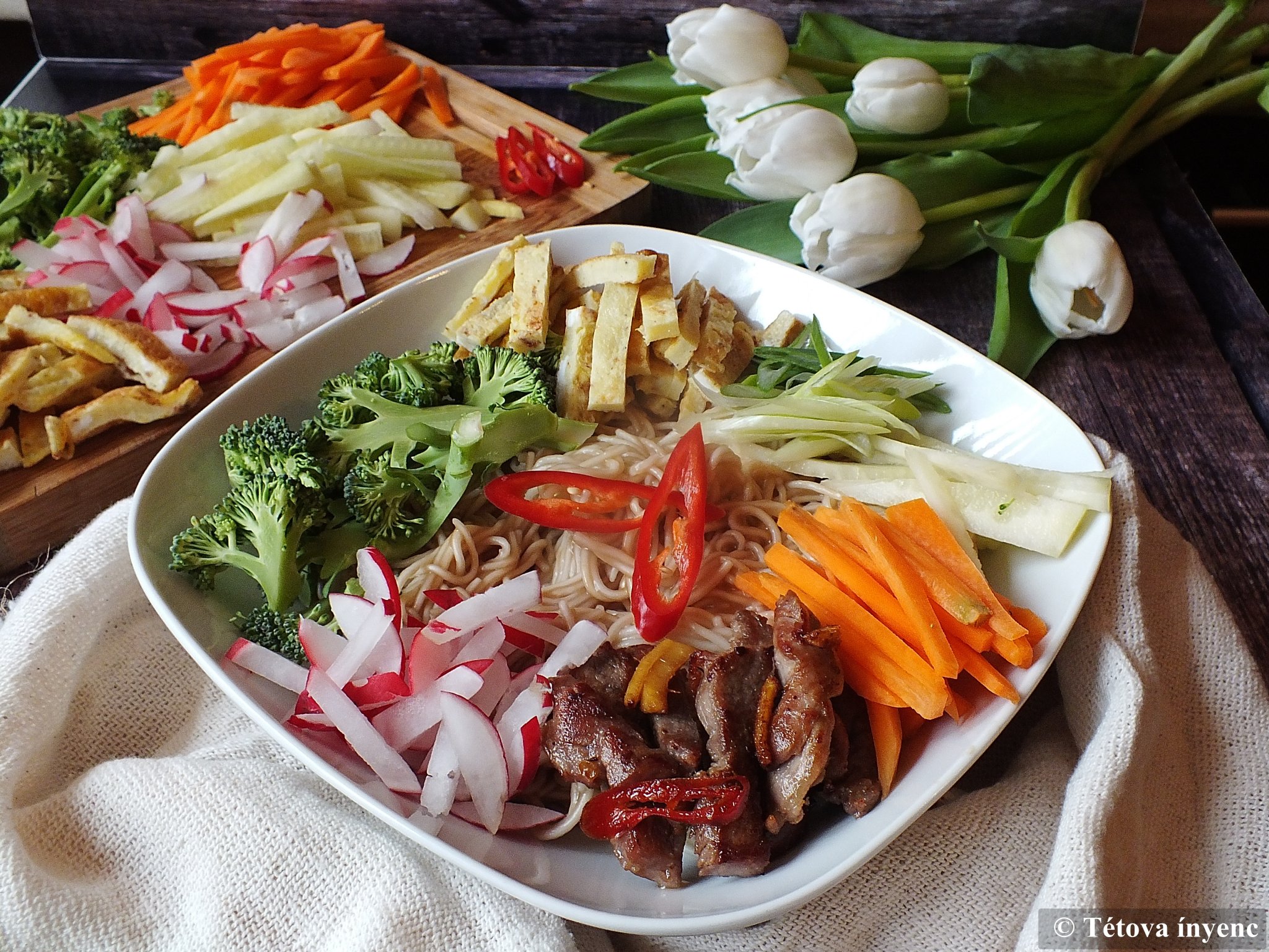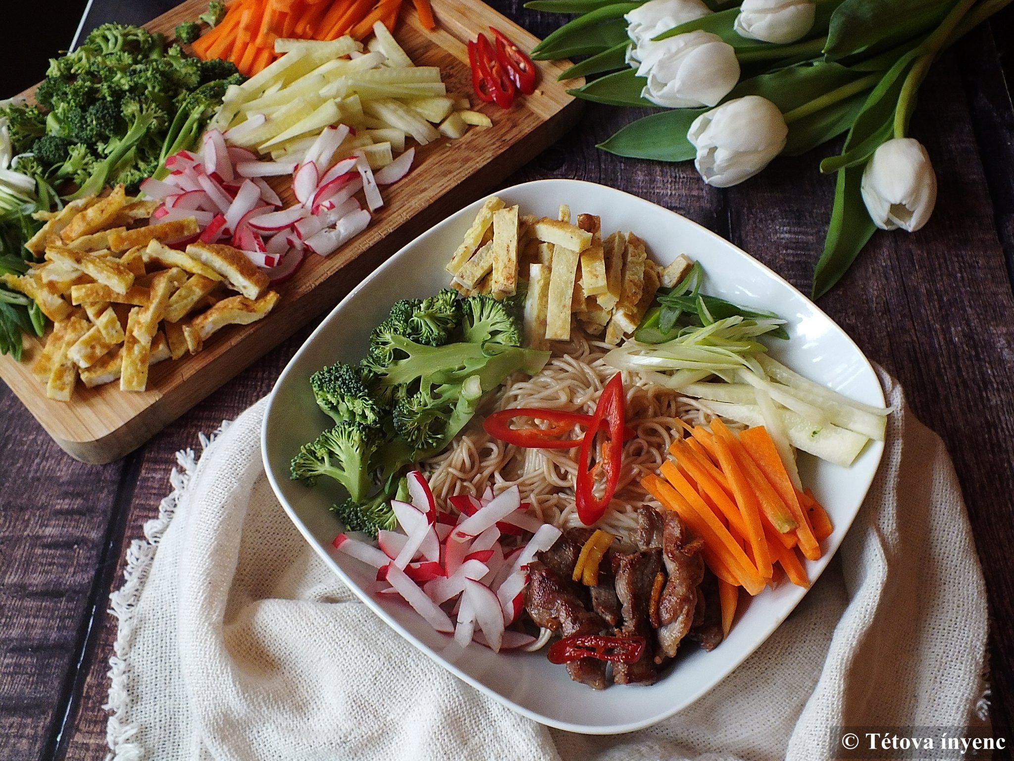A japán somen tészta olyan, mint egy filigrán műtárgy. Én most egyáltalán nem autentikus módon készítettem, inkább amolyan „ami van itthon, abból főzünk” fogás lett. Percek alatt elkészül, ráadásul a csíkokra vágott bélszínnek és az omlettnek sem kell sok idő. Friss,nyers tavaszi zöldségekkel igazán laktató és egészséges fogás.