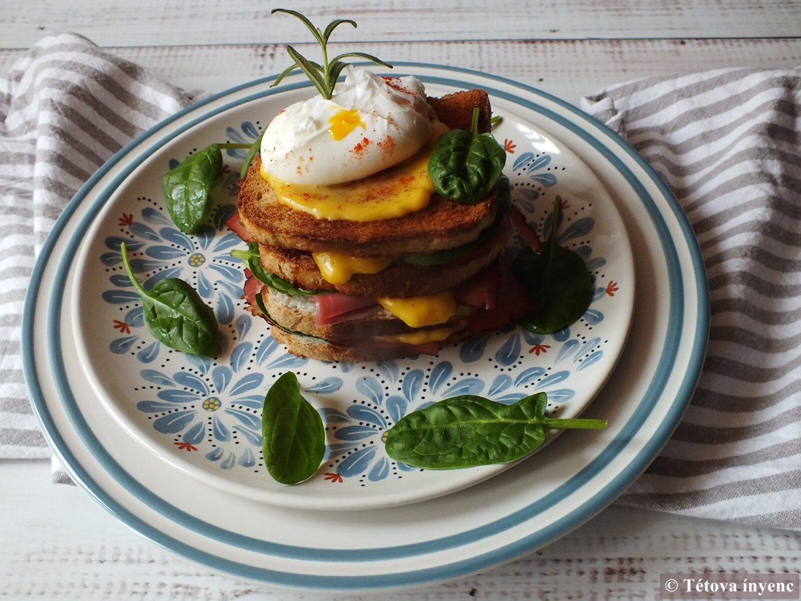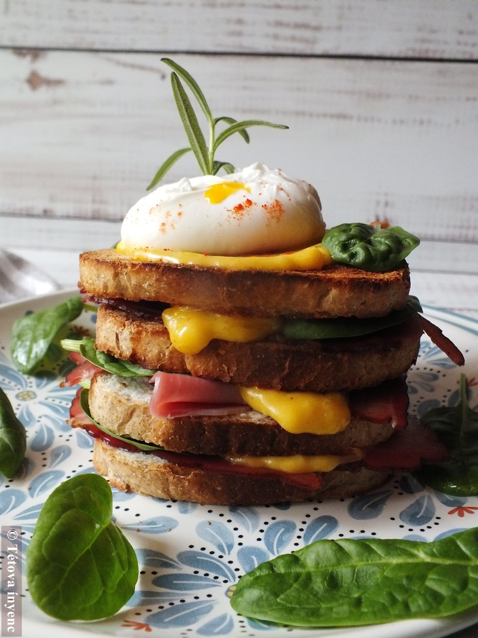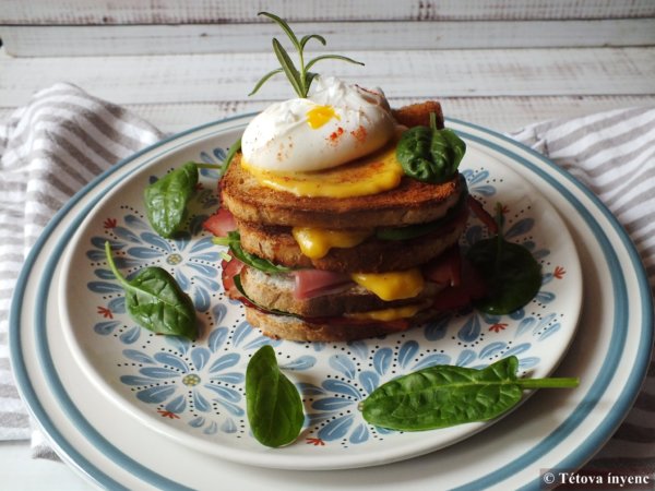 7. A kenyérszeleteket egymásra tornyozzuk. Az utolsó szeletre a maradék hollandi mártás és a buggyantott tojás kerül, valamint spenót. A tojást sózzuk, paprikázzuk és a szendvicset tálaljuk.
