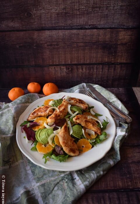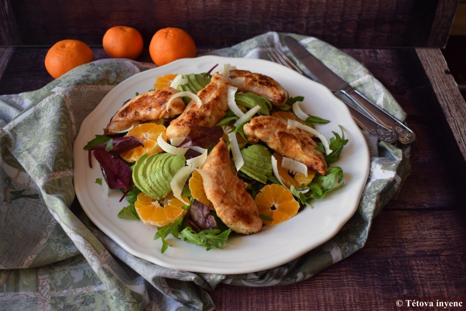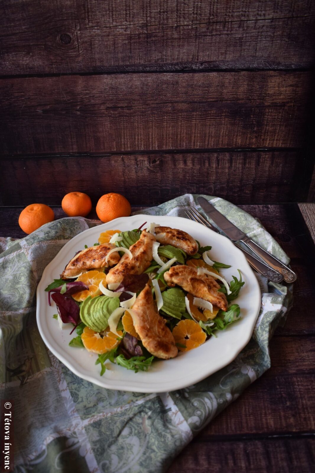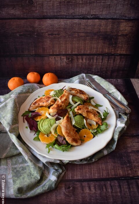 - A hozzávalókból összeállítom a salátát. Kevés olívaolaj-mandain öntettel meglocsolo, sózom, borsozom.
