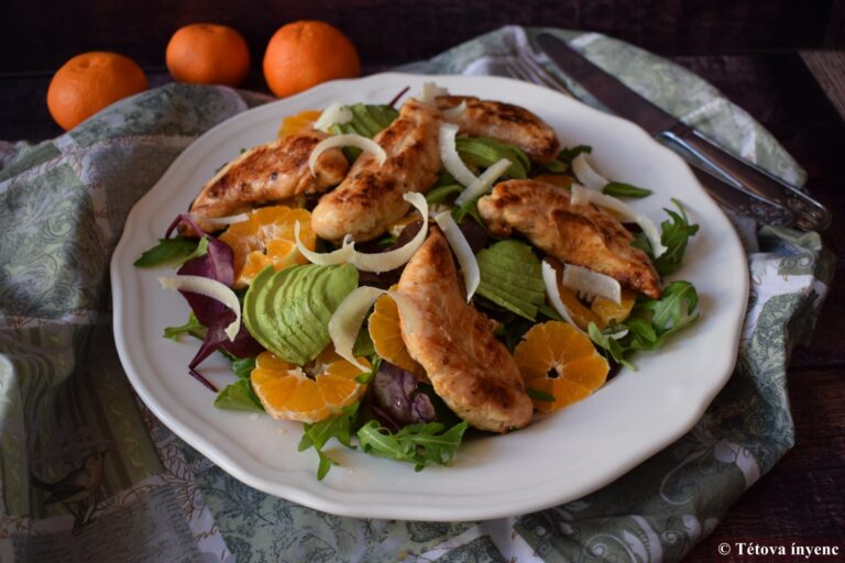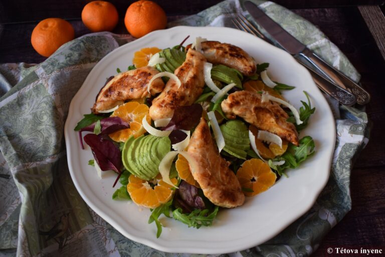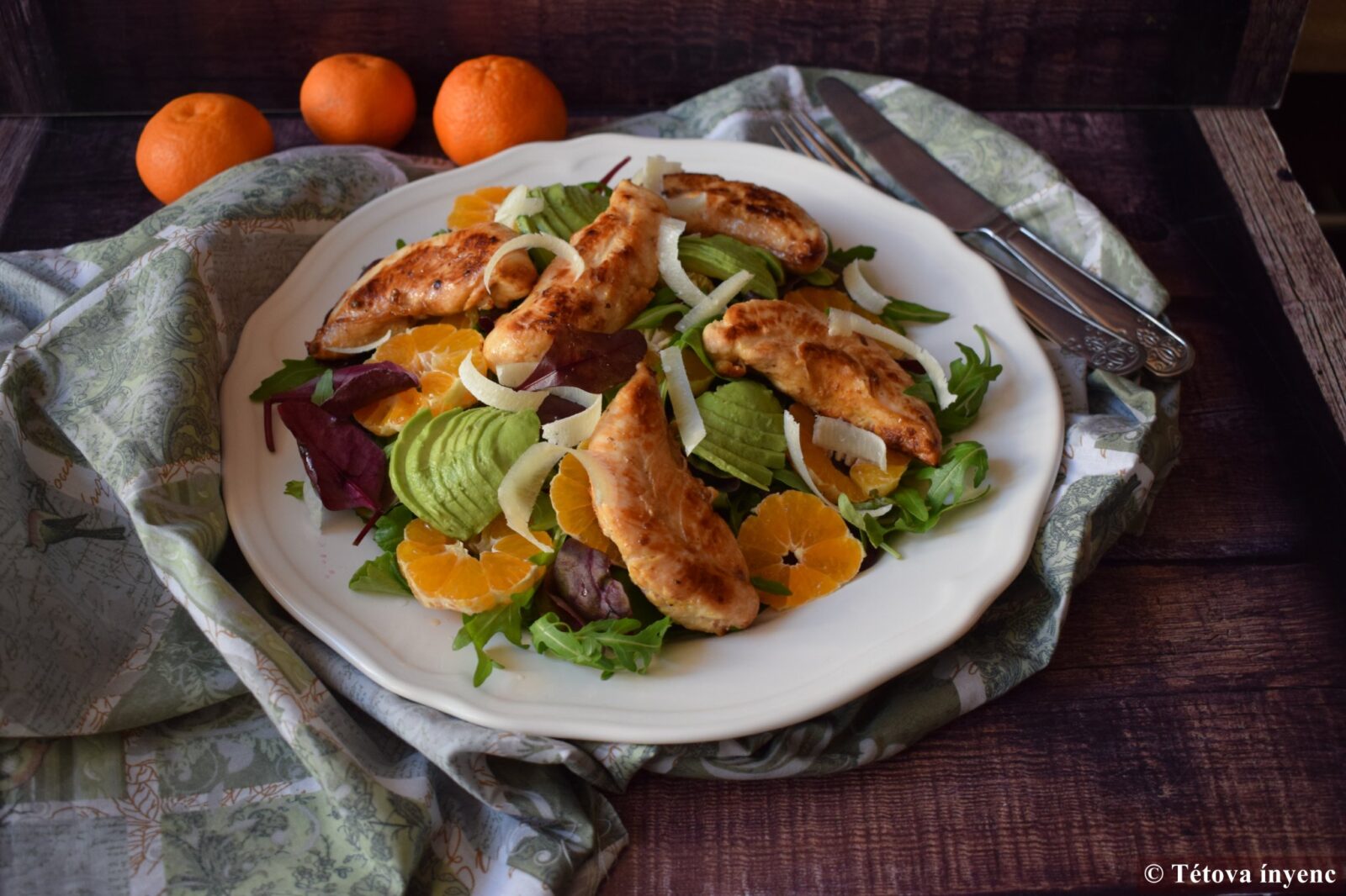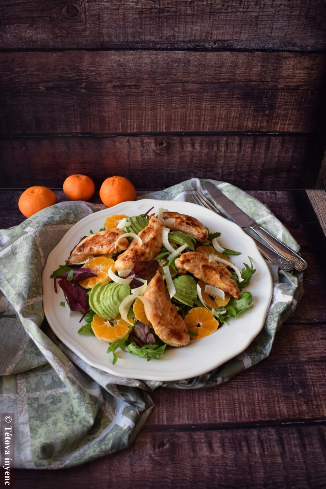 - A hozzávalókból összeállítom a salátát. Kevés olívaolaj-mandain öntettel meglocsolo, sózom, borsozom.