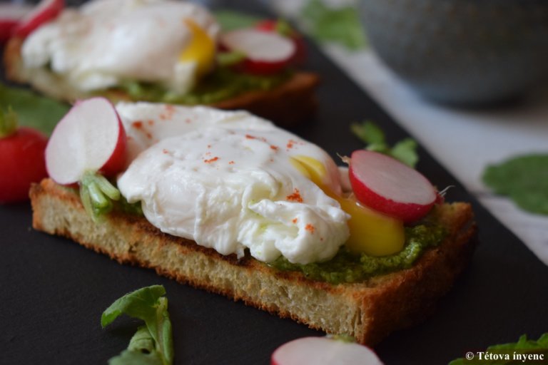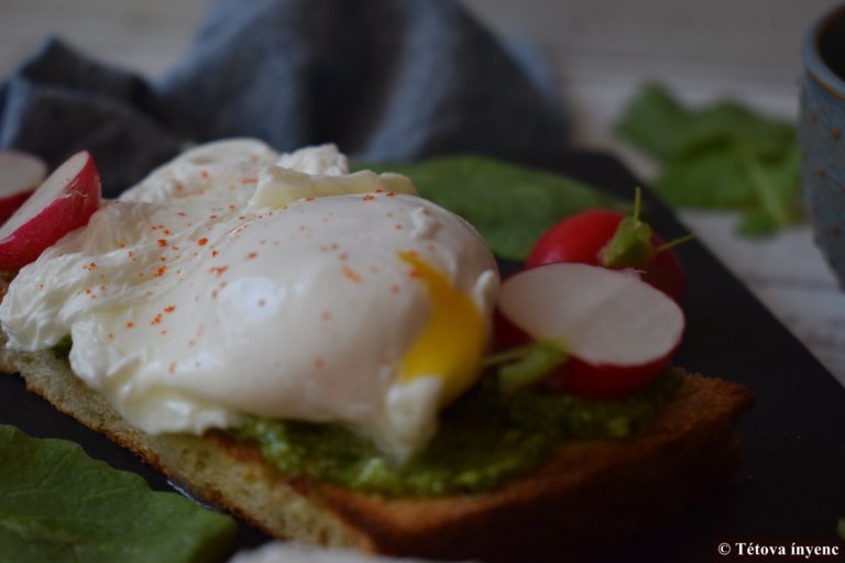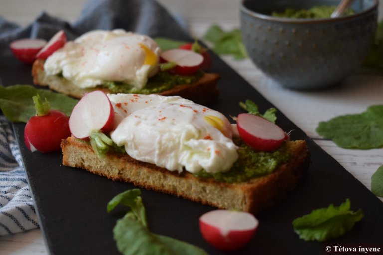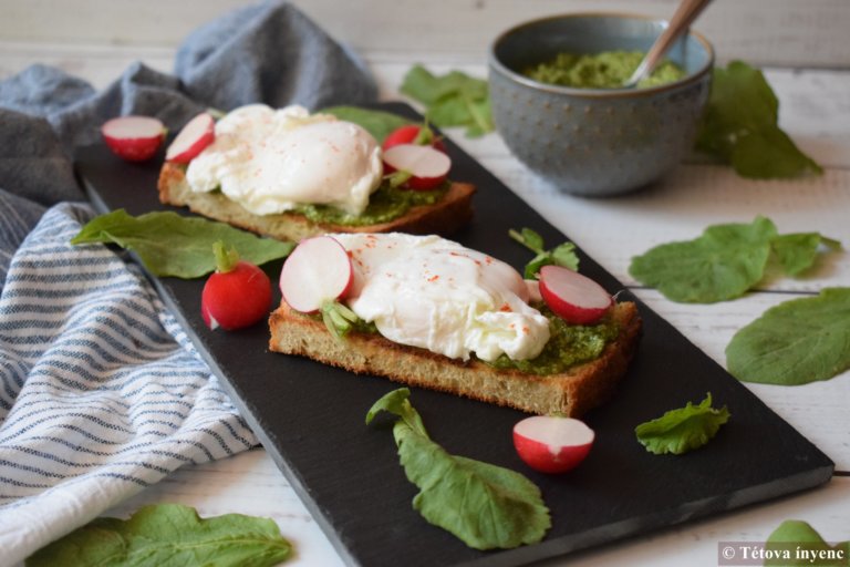 - Összeállítom a szendvicset: A pirított kenyérszeletet megkenem reteklevél pesztóval. Ráhelyezem a tojást, megszórom sóval, paprikával.