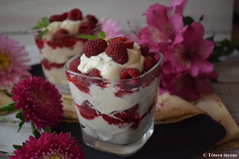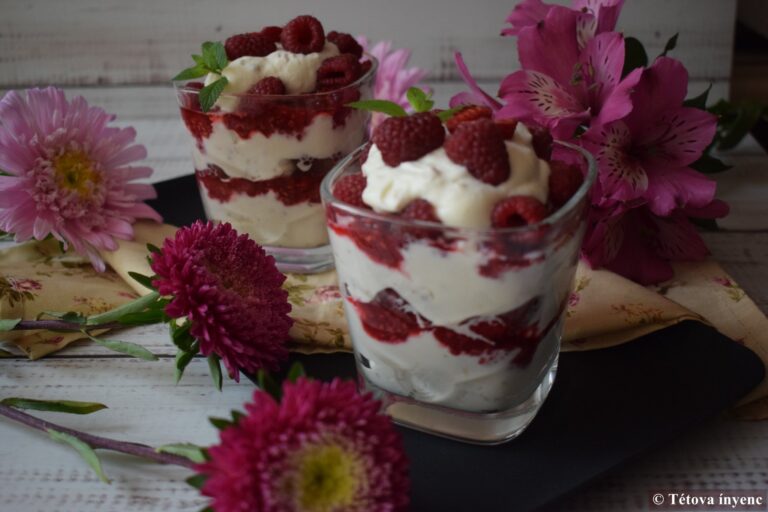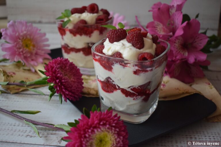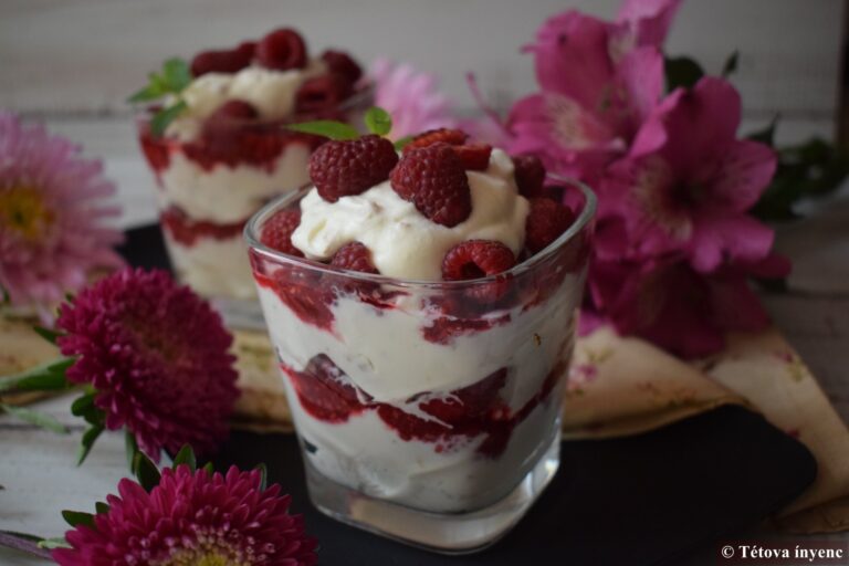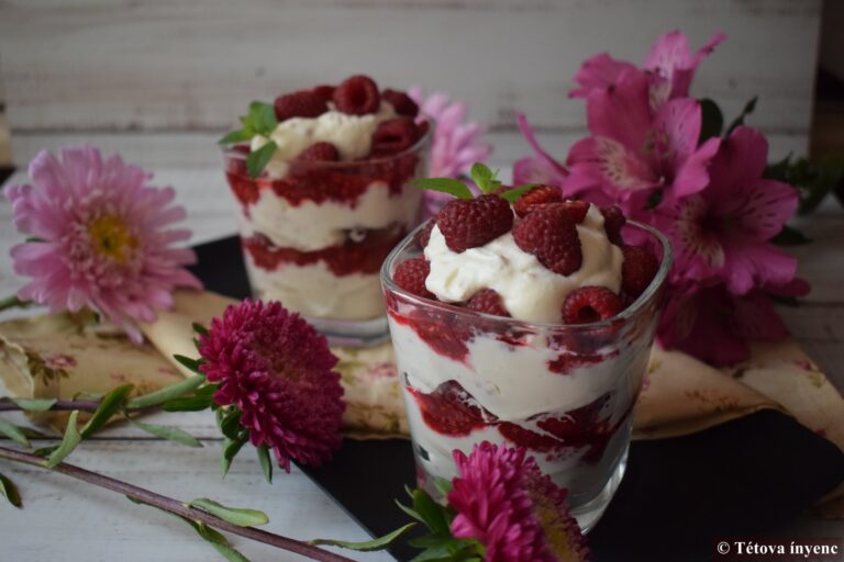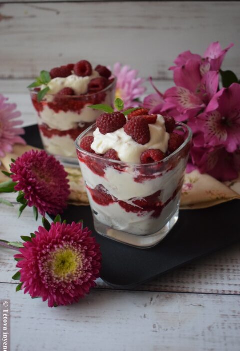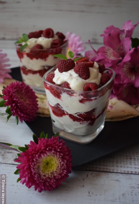- A poharakba rétegesen rakom a tejszínt, a málnavelőt, néhány szem málnát. A tetejére málna kerüljön.
