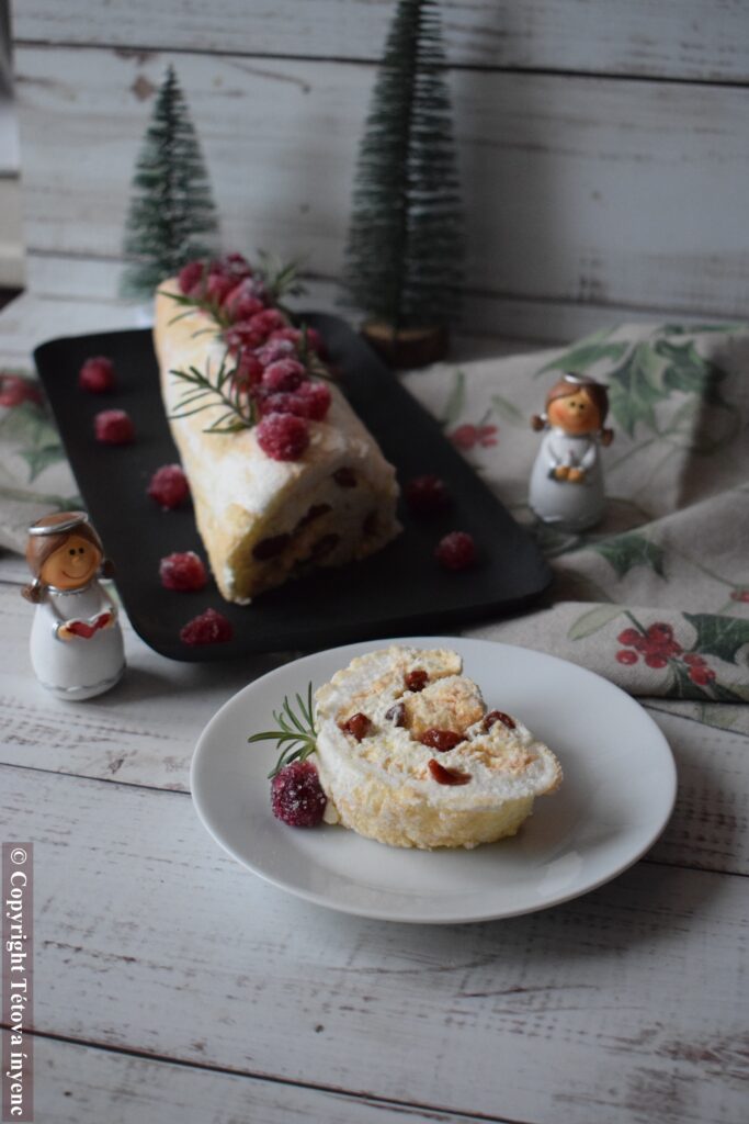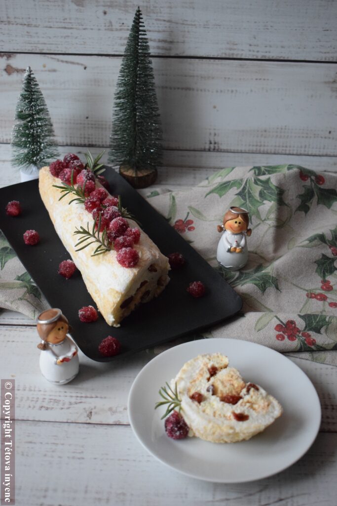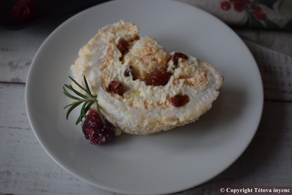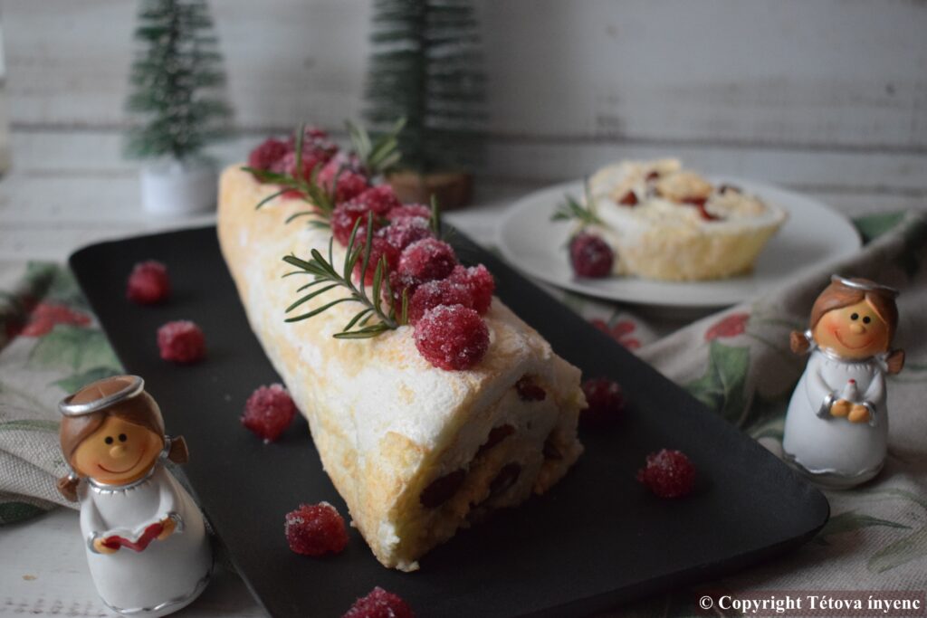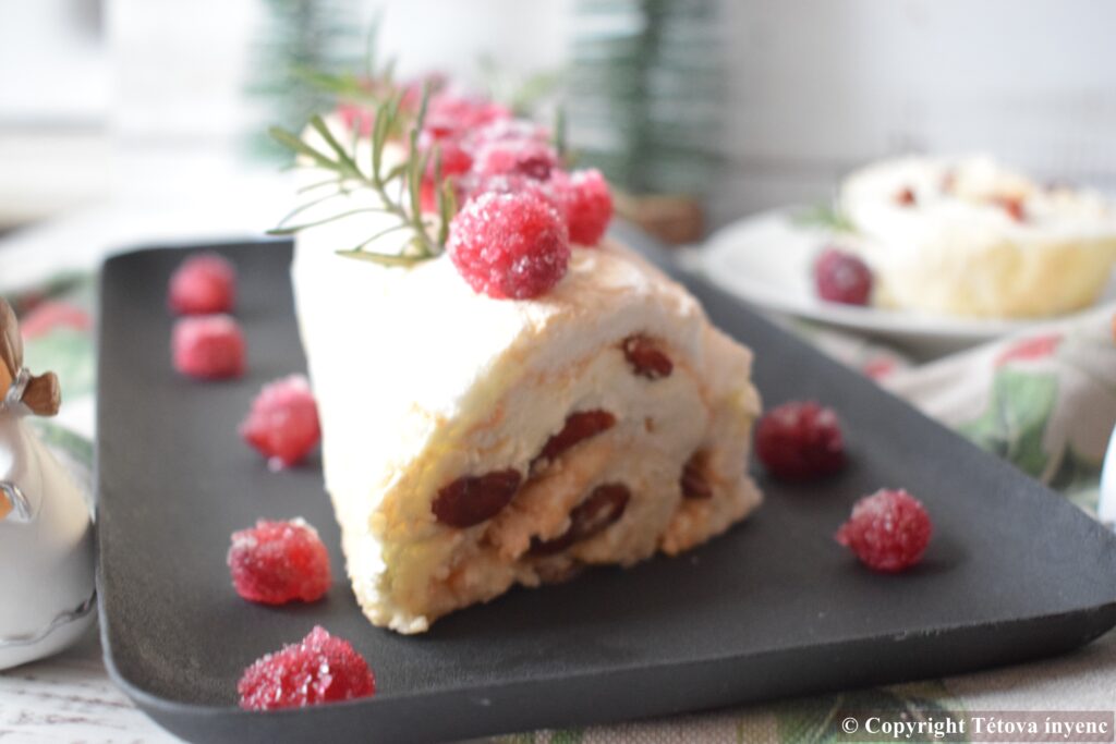 - A tetjét megszórom porcukorral. Egy csíkban kevés habot kenek végig a tetején. Erre rakom a vörös áfonyát és a rozmaring ágacskákat.