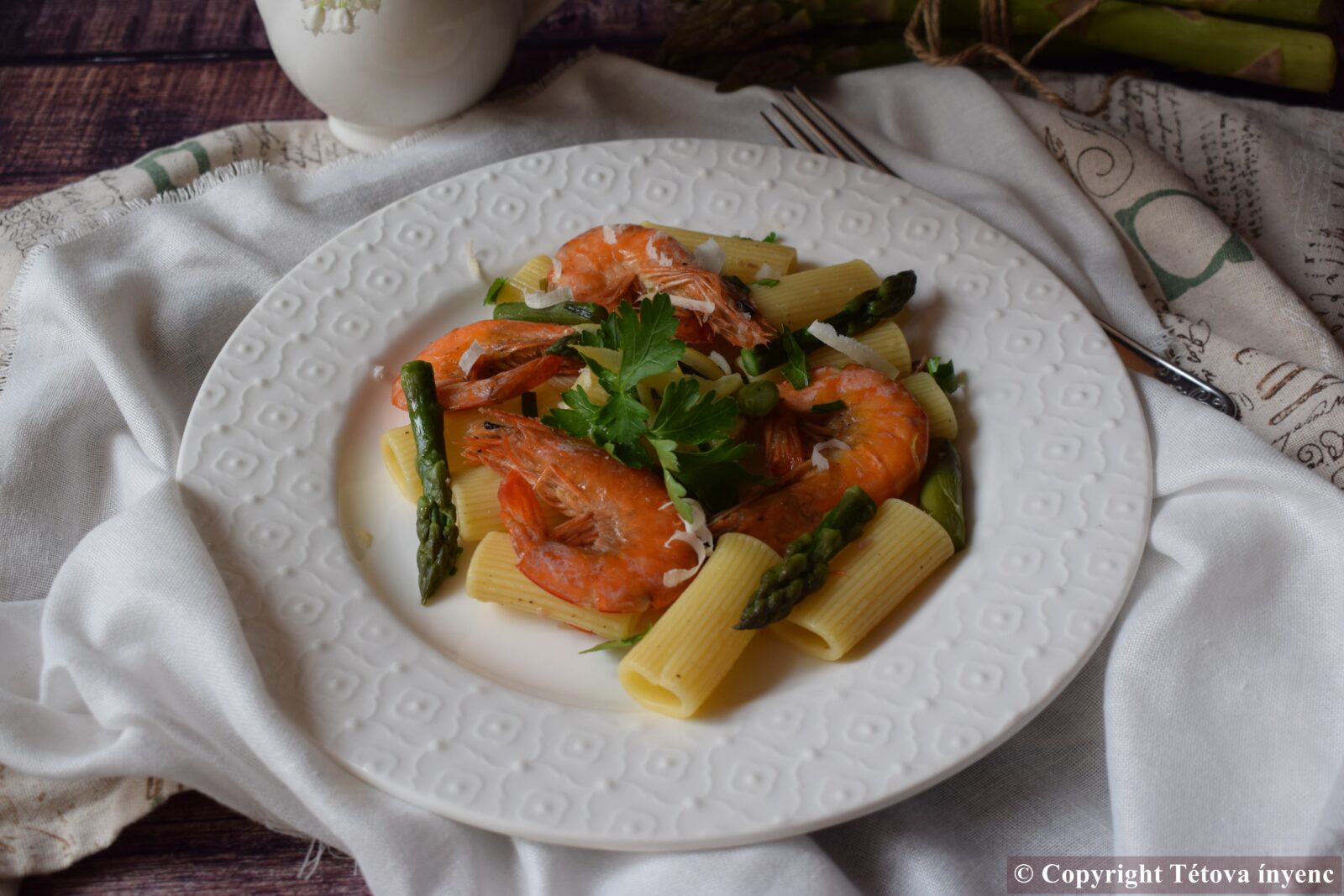 - A spárgás rigatonit leszűröm-kevés főzővizet meghagyok-és a garnélarákhoz kavarom.
