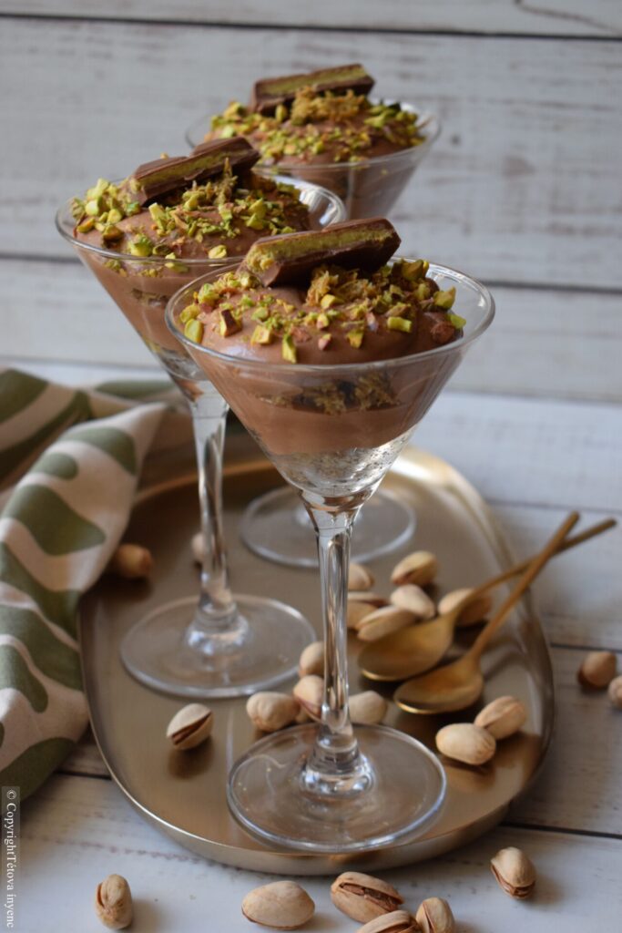 - A pohárkrém tetejét néhány kocka dubaji csokival és tört pisztáciával díszítem.